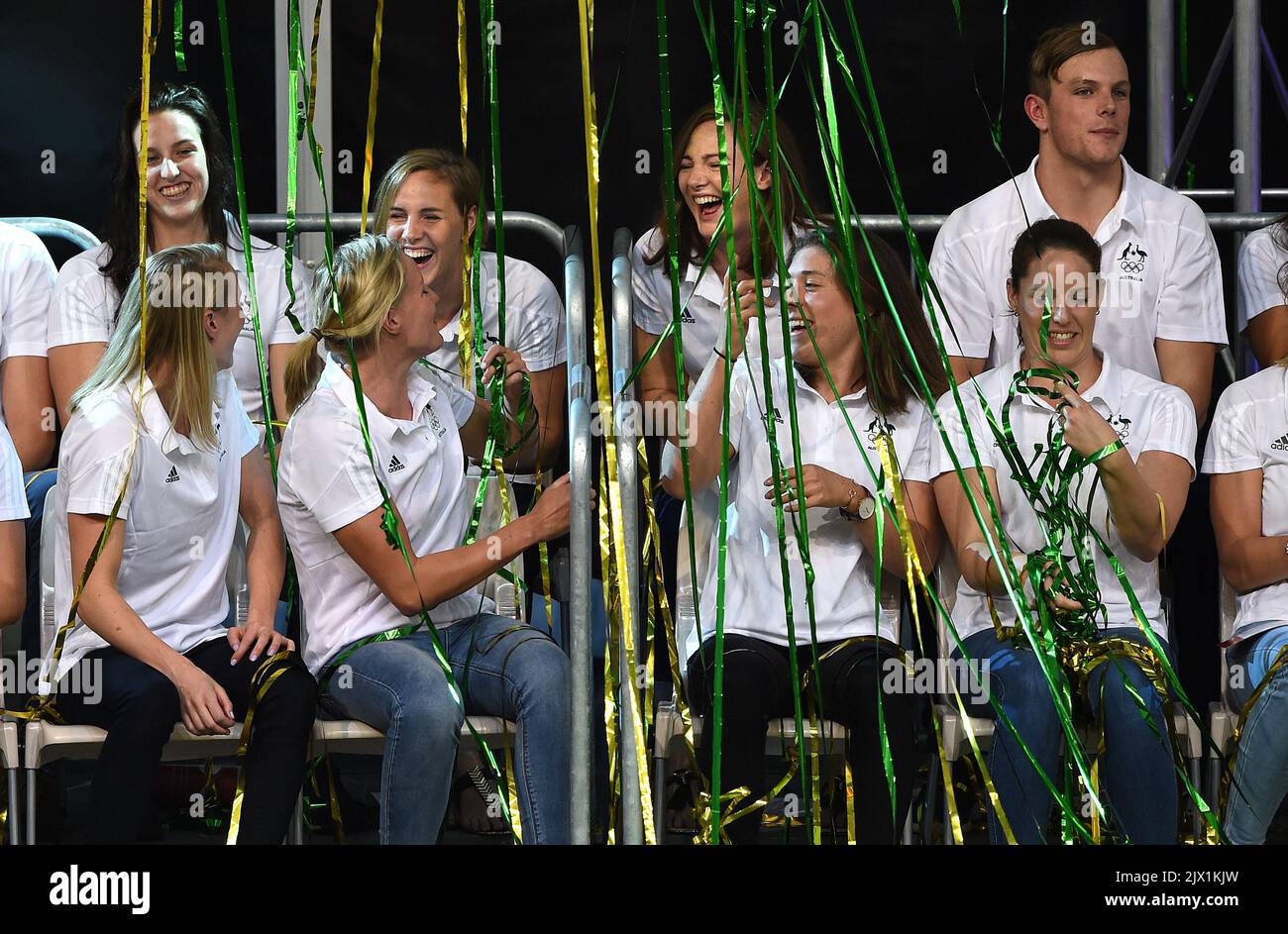 Am 8 Tag Der Australian Swimming Championships Im Sa Aquatic And Leisure Centre In Adelaide Donnerstag Den 14 April 2016 Fallt Ein Flickerband Uber Australische Schwimmer Wahrend Einer Prasentation Des Boarding Pass